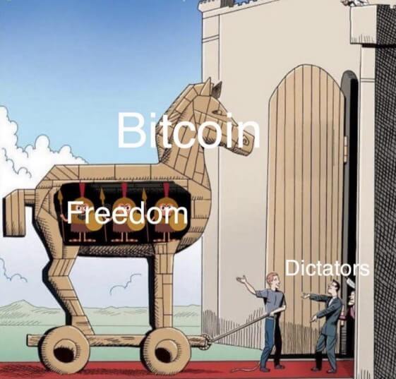 Cette métaphore est régulièrement utilisée dans l’écosystème des cryptomonnaies. Bitcoin est ainsi parfois désigné comme un « cheval de Troie de la liberté » : un actif alléchant offert au système financier qui s’empresserait de l’adopter, ce qui conduirait à détruire la base sur laquelle il repose, c’est-à-dire le contrôle sur la monnaie.